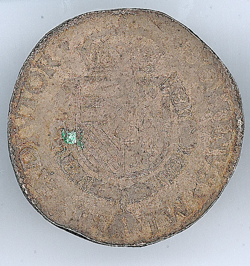 Keerzijde: het gekroonde Spaans-Oostenrijks-Bourgondische wapen, waaronder het Gulden Vlies hangt, met een omschrift.