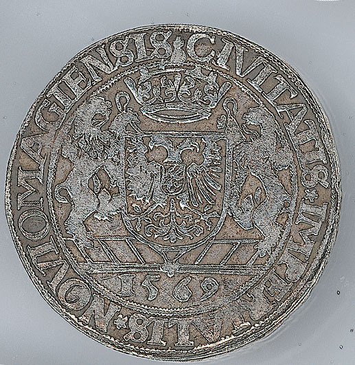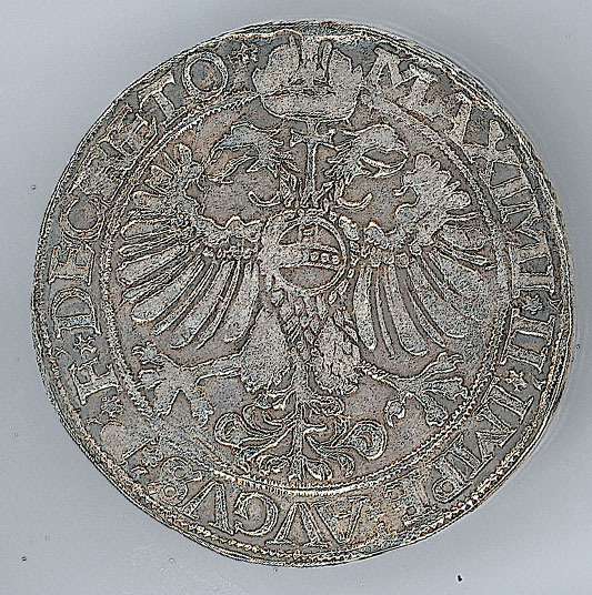 Keerzijde: binnen een parelrand een dubbelkoppige adelaar met de rijksappel op de borst en de keizerskroon erboven, met een omschrift en een parelrand om het geheel.