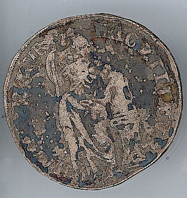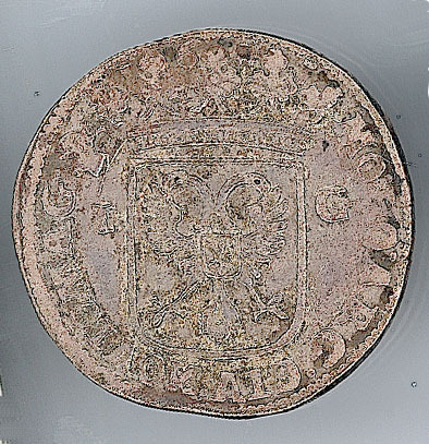 Keerzijde: de Nederlandse maagd, staande, met lans en vrijheidshoed in de rechterhand, met de linkerhand leunend op een bijbel op een sokkel, met een omschrift. Om het geheel een parelrand.