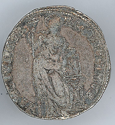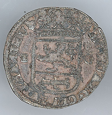 Keerzijde: de Nederlandse Maagd staande met een lans en vrijheidshoedin de rechterhand, met de linkerhand leunend op een bijbel op een sokkel, met een omschrift. Om het geheel een parelrand.