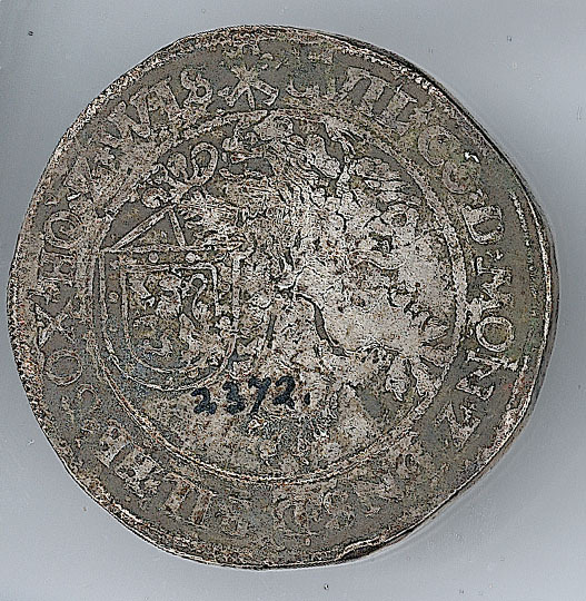 Keerzijde: binnen een parelrand een leeuw met in zijn klauwen een wapenschild waarop een klimmende leeuw, met een omschrift. Om het geheel een parelrand.