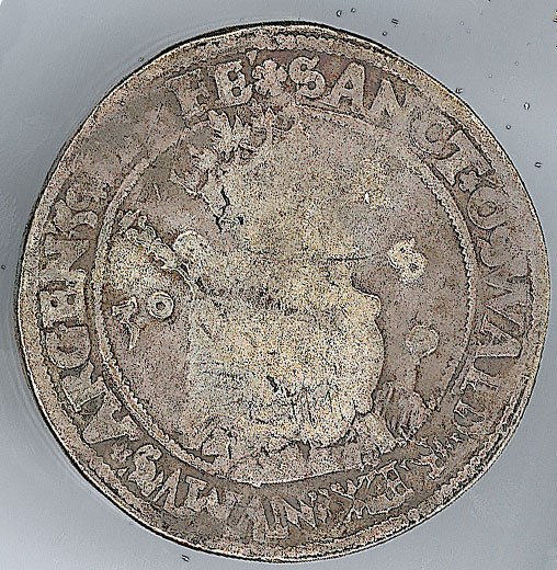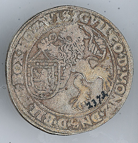 Keerzijde: binnen een parelrand een leeuw met in zijn klauwen een wapenschild waarop een klimmende leeuw, met een omschrift. Om het geheel een parelrand.