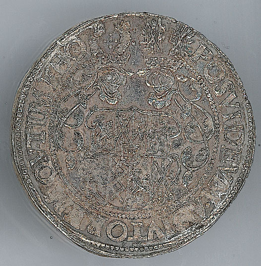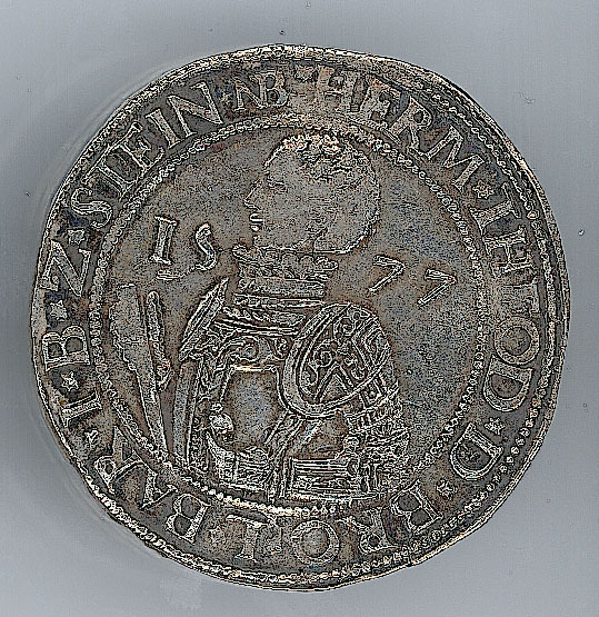 - BeschrijvingVoorzijde: binnen een parelrand het geharnaste borstbeeld van de graaf van Bronkhorst geflankeerd door het jaartal 1577, met een omschrift. Om het geheel een parelrand. Keerzijde: binnen een parelrand een wapen bekrond met twee helmtekens, met een omschrift. Om het geheel een parelrand.