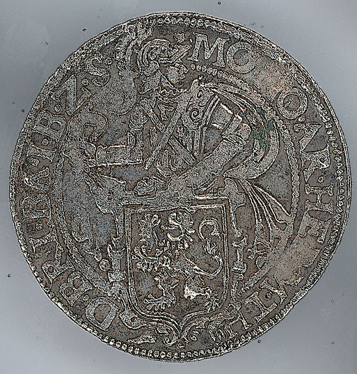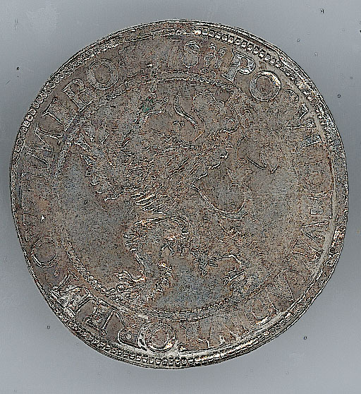 - BeschrijvingVoorzijde: binnen een parelrand een geharnaste ridder met voor zich een schild waarop een klimmende leeuw, met een omschrift. Om het geheel een parelrand. Keerzijde: binnen een parelrand een gekroonde klimmende leeuw, met een omschirft. Om het geheel een parelrand.