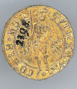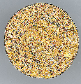 Keerzijde: binnen een parelrand de geharnaste graaf, een zwaard geheven in de rechterhand, staande tussen de Hollandse leeuw en het wapen van Beieren, met een omschrift. Om het geheel een parelrand.