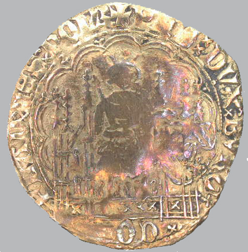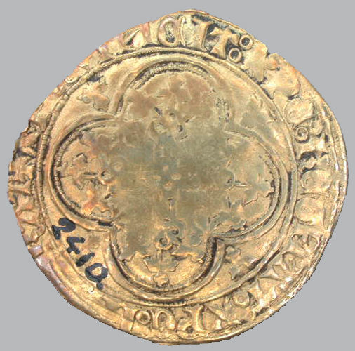 - BeschrijvingVoorzijde: binnen een parelrand een tronende vorst met een wapenschild van Bourgondië, met een omschrift. Keerzijde: binnen een parelrand en een vierpas een gebloemd kruis, met een omschrift.