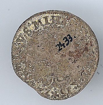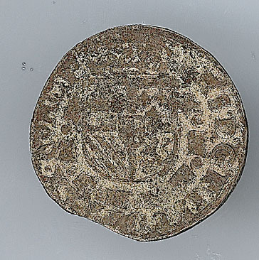 Keerzijde: gebloemd kruis met een bloem in het hart (geen muntteken), met een omschrift. Om het geheel een parelrand.