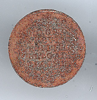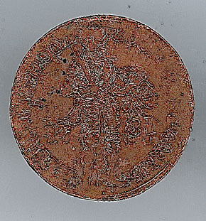 - BeschrijvingAfslag in koper van een gouden Hollandse dukaat. Voorzijde: staande ridder met zwaard en pijlenbundel geflankeerd door het jaartal 17 - 81, met een omschrift. Keerzijde: vierkante cartouche met een rankendecoratie en een opschrift.
