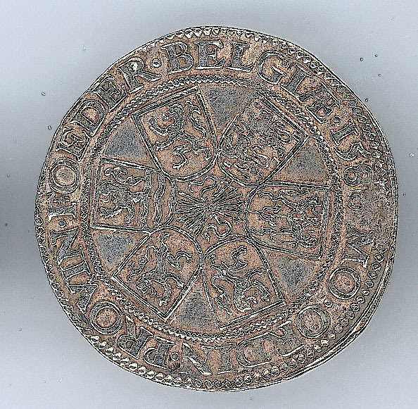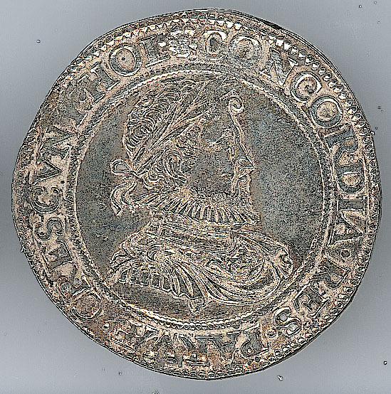 Voorzijde: binnen een parelrand een buste 'en profil' van Leicester met lauwerkrans om het hoofd, met een omschrift. Om het geheel een parelrand.