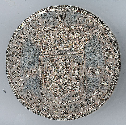 Keerzijde: het gekroonde wapen van de Zeven verenigde Provinciƫn, geflankeerd door het jaartal 1735, met een omschrift. Om het geheel een parelrand.