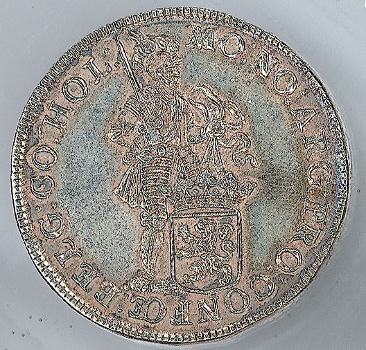 Voorzijde:staande geharnaste en gehelmde man, het gekroonde wapenschild van Holland aan een lint in de linker hand, met een omschrift. Om het geheel een parelrand.