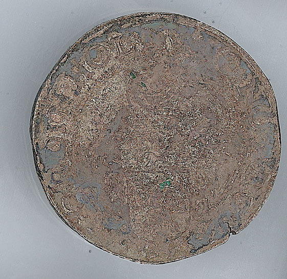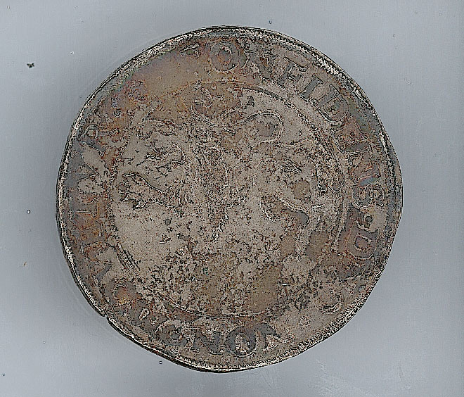 Keerzijde: binnen een parelrand een klimmende leeuw, met een omschrift. Om het geheel een parelrand.