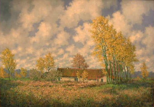- BeschrijvingTegen een bewolkte hemel ligt midden in het land een witte boerderij met rood dak. Rechts enkele hoge bomen. De voorgrond is een mengeling van groene en gele tinten.