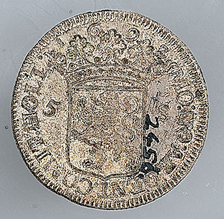 Keerzijde: het gekroonde wapen van Holland, geflankeerd door de waarde-aanduiding 5-S Boven de kroon het jaartal 1682, met een omschrift. Om het geheel een parelrand.