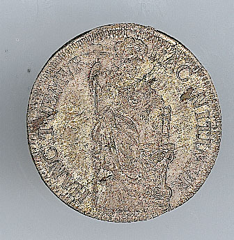Voorzijde: staande Nederlandse Maagd / Pallas Athene met lans en vrijheidshoed in de rechter hand, de linker hand leunend op een bijbel op een piedestal, met een omschrift. Om het geheel een parelrand.