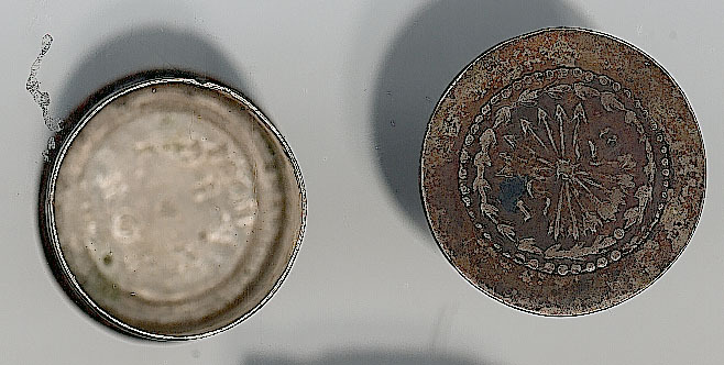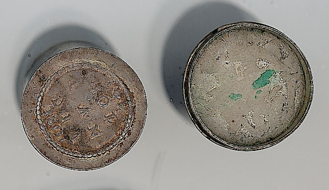 Cilindervormig doosje met een los deksel, bestaande uit een rond plaatje en een opstaande geprofileerde rand, die over het doosje sluit. In het deksle is de keerzijde van een Hollandse stuiver geslagen met binnen een parelrand een lauwerkrans om een pijlenbundel, die geflankeerd wordt door de waarde-aanduiding 1-S. In de bodem van het doosje is de voorzijde van de Hollandse stuiver geslagen, met binnen een parelrand een opschrift. Aan de binnenzijde is dit opschrift in spiegelbeeld doorgeslagen hetgeen er op wijst dat geen normale in omloop geweest zijnde stuivers in deksel en bodem zijn verwerkt. Aan de binnenzijde van het deksel lijkt een munt verwerkt te zijn met als beeldenaar een Nederlandse leeuw met zwaard en pijlenbundel, mogelijk een zilveren duit.