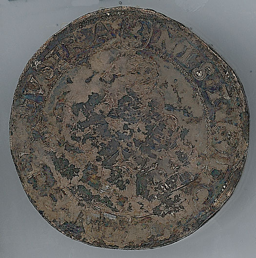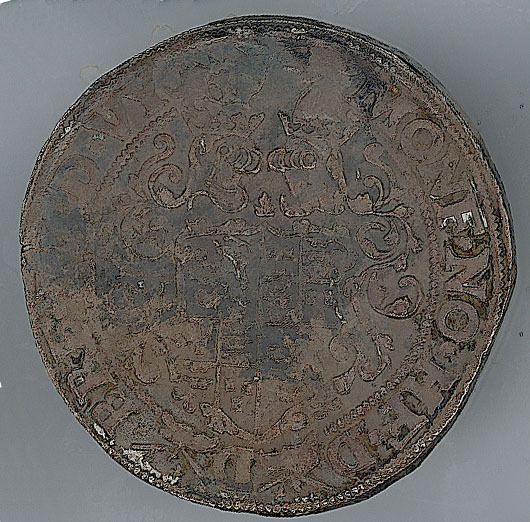Keerzijde: binnen een parelrand een gekwartierd schild, bekroond met twee gecimierde helmen. Om het geheel een parelrand.