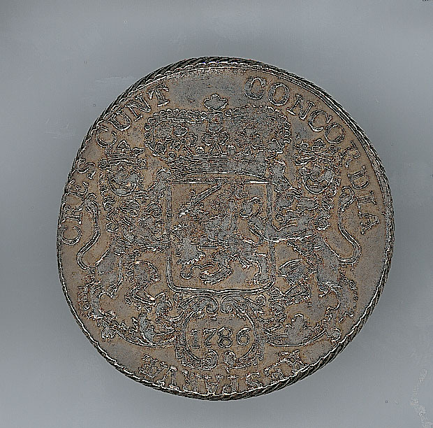Keerzijde: binnen een getrokken rand het gekroonde wapen van de Staten-Generaal geflankeerd door twee staande gekroonde leeuwen, met een omschrift. Onder het wapen in een cartouche het jaartal 1786. Om het geheel een kabelrand.