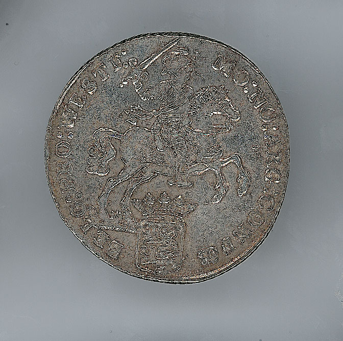 Voorzijde: binnen een getrokken rand een geharnaste ridder te paard, een geheven zwaard in de rechterhand, met een omschrift. Midden onder het wapen van West-Friesland.