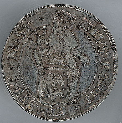 Voorzijde: binnen een getrokken rand een naar links staande ridder met een zwaard over de linker schouder en het gekroonde wapen van West-Friesland aan linten voor zich, met een omschrift. Om het geheel een parelrand.