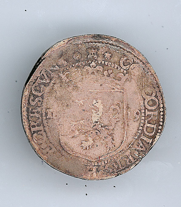 Keerzijde: Binnen een parelrand het gekroonde wapen van de Staten Generaal, geflankeerd door het jaartal 16-19. Omschrift: CONCORDIA.RES.P[ARVA]E.CRESCVNT[toren]. Om het geheel een parelrand.