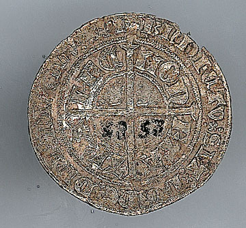Keerzijde: Een gevoet kruis dat de binnenste van drie concentrische parelranden doorsnijdt. Twee concentrische omschriften: buiten: +BNDICTV:SIT:NOME:DNI:NRI:IHV:XPI en binnen: MON-ETA-TRA-IEC.
