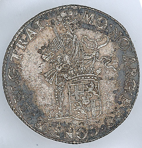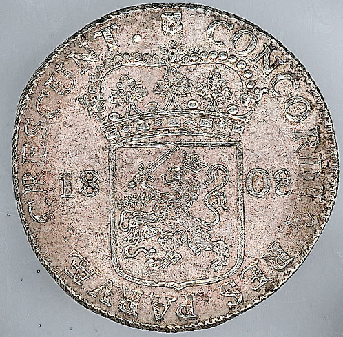 - BeschrijvingGeslagen te Utrecht onder muntmeester J. van Romond. Voor- en keerzijde gelijk aan inv.nr. 2602, maar dan zonder getrokken binnencirkels. In het omschrift op de keerzijde het muntmeestersteken 'rozet'.