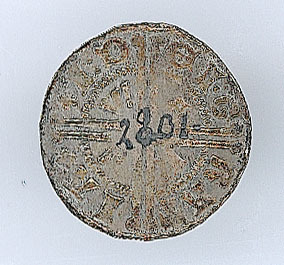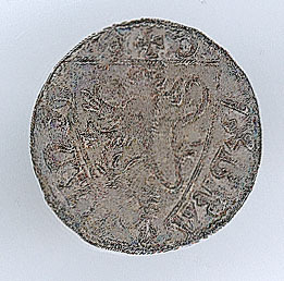 - BeschrijvingSterling uit de periode van Jan I. Voorzijde: leeuw op een schild met omschrift. Keerzijde: dubbellijnig gevoet kruis met de letters W A L T binnene een parelcirkel, met een omschrift.