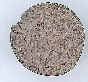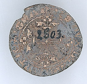 - BeschrijvingDubbele sterling met St. Michaël. Voorzijde: een gevelugeld engel (St. Michaël) met een lans, meet een omschrift. Keerzijde: een gebloemd kruis binnen een parelrand., met een omschrift.