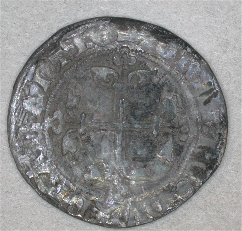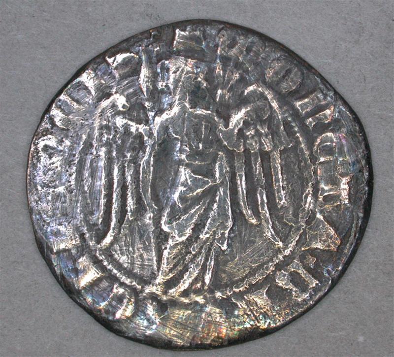 - BeschrijvingDubbele sterling met St. Michaƫl. Voorzijde: een gevelugelde engel met lans, met een omschrift. Keerzijde: gebloemd kruis tot een parelrand, met een omschrift.