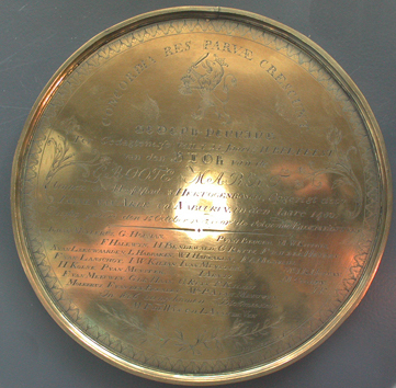 - BeschrijvingVoorzijde: markte te 's-Hertogenbosch, stadswapen. Opschrift: ALLENLYK, DAT WY DEN ARMEN ZOUDEN GEDENKEN! GAL: 2. VS:10. Achterzijde: namen van de blokmeesters. Opschrift: CONCORDIA RES PARVAE CRESCUNT
