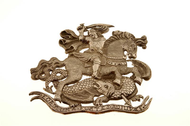 Sint Joris, met opgeheven zwaard, te paard en met draak. Op de banderol onderaan: "FORTUNA * FORTES * ADIUVAT *". Plaat (beslag) voor op de borst of bandelier van de Jonge Voetboog (mogelijk ook beslag van een patroontas). Aan achterzijde vier haken ter bevestiging. Vergelijkbare exemplaren van Sint Jorisgilden in Diessen, Nieuwkuijk en Hilvarenbeek.