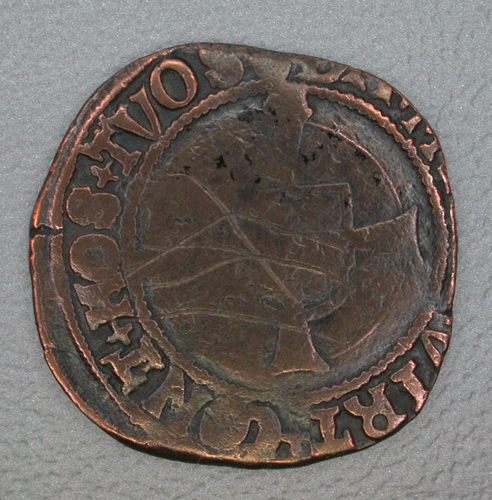 - BeschrijvingVz: binnen een parelrand het gehele veld beslaande Oostenrijks-Bourgondische wapen; omschrift: KAROLVS+[ROMANOR+IM[PER]+H.REX] Kz: binnen een parelrand een gevoet kruis, beladen met een wapen; omschrift: [DA+MICHI+]VIRT+CONT+HOS+TVS
