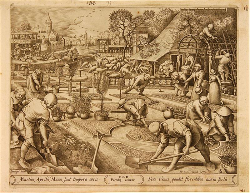 - BeschrijvingOnderschrift: "VER/Pueritie compar Martius, Aprilis, Maius, sunt tempora ueris. Vere Venus gaudet florentibus aurea sertis." Eerste staat (van 2)