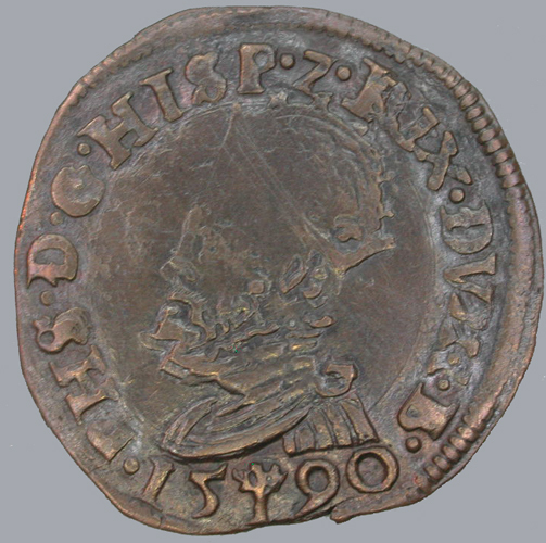 - BeschrijvingVz:gekroonde buste naar links, daaronder het jaartal 15 boompje 90; omschrift: .PHS.D.G.HISP.Z.REX.DVX.BRA. Kz:gekroond Oostenrijks-Bourgondische wapen; omschrift: DOMINVS.MIHI.A¬DIVTOR