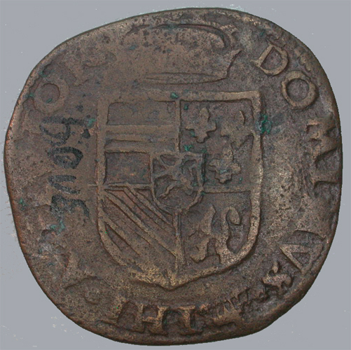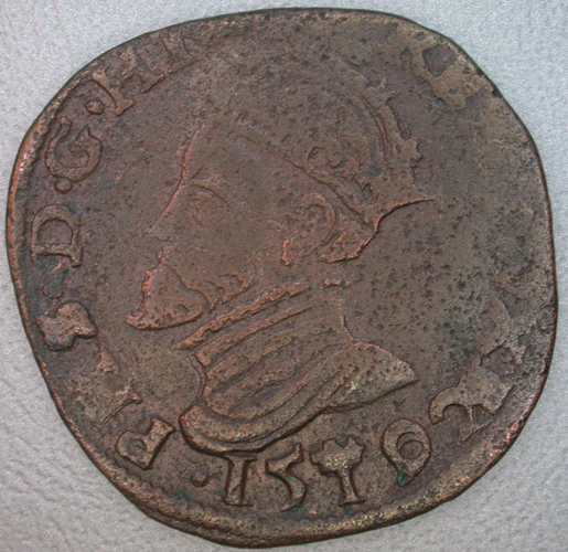 - BeschrijvingVz:gekroonde buste naar links, daaronder het jaartal 15 boompje 92; omschrift: .PHS.D.G.HISP.Z.REX.DVX.BRA. Kz:gekroond Oostenrijks-Bourgondische wapen; omschrift: DOMINVS.MIHI.A¬DIVTOR