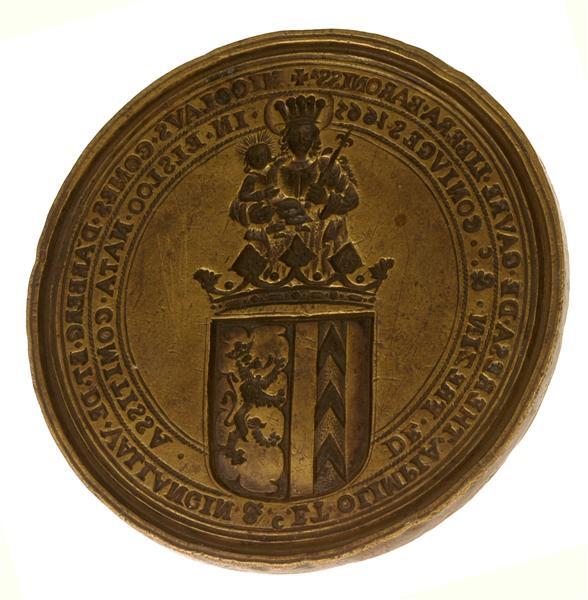 Rond koperen zegelstempel met het wapen van de familie d'Arberg en de familie de Grave. Gedeeld wapenschild met een halfcirkelvormige onderkant. Op het linkergedeelte een gekroonde getongde en dubbelstaartige leeuw. Op het rechtergedeelte een paal in goud met drie kepers op een veld van zilver. Het schild wordt gedekt door een kroon van waaruit een Onze-Lieve-Vrouwebeeld oprijst, met het Christuskind op de arm en in de linkerhand een scepter. Randschrift: NICOLAUS . COMES . D'ARBERG . ET . DE VALLANGIN & . OLIMPIA . THERESA . DE GAVRE . LIBERA . BARONISSA + IN ELSLOO NATA . COMITISSA . DE . FREZIN .&.c. CONIVGES . 1665. Op de achterzijde een koperen handgreep.