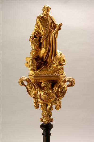 Verguld houtsnijwerk op gedeelte van de zwarte stok. Console met lofwerk waarop twee schildjes met het opschrift "1846" (vóór) en "S LUCAS" (achter). Sint Lucas houdt in de rechterhand de rechter hoorn van een achter hem liggend rund vast. In de linker hand houdt hij een plaat (boek). Op de grond rechts voor hem een palet en een bijenkorf.